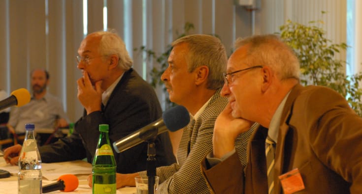 2007 berichtet Prof. Franz Adlkofer auf der Offenen Akademie in Gelsenkirchen über die Ergebnisse der REFLEX-Studie. v.l.n.r.: Prof. Franz Adlkofer, Prof. Josef Lutz (TU Chemnitz), Prof. em. Rainer Frentzel-Beyme (Uni Bremen). Foto:diagnose:funk