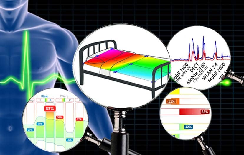Gibt Auskunft welche Arten von störenden Elektrosmogfelder sie die ganze Nacht ausgesetzt sind und somit Ihren Körper ständig in einem Stresszustand versetzt. Mobilfunk GSM-UMTS-LTE, WLAN 2.4 + 5 GHz, UPC Wi-free, DECT-Funktelefon, Wi-Fi Hotspots, digitales Radio + TV DAB DVB, elektrische Installationen wie Geräte und Leuchten, Felder von aussen wie Hochspannungsleitungen, Trafostationen, Kabeltrassen, Sendetürme, Radar, Erdung, Dirty-Power, Erdmagnetfeldverzerrung, etc. - Mutung von Störfelder mittels Radiästhesie