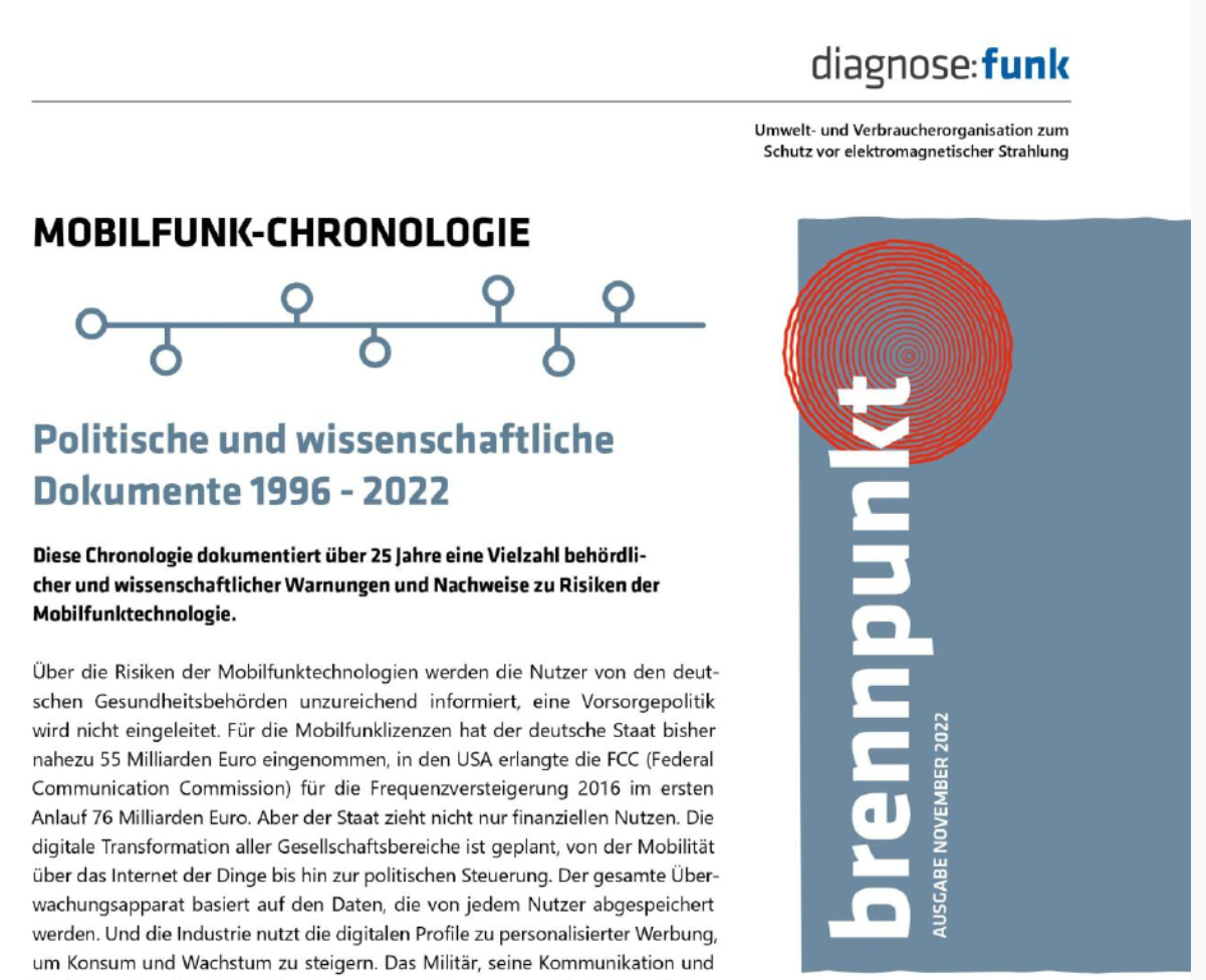 Mit dieser Chronologie dokumentiert diagnose:funk eine Vielzahl behördlicher und wissenschaftlicher Warnungen und Nachweise zu Risiken der Mobilfunktechnologie. Sie ist ein Recherchetool, eine Argumentationshilfe und dokumentiert die kontinuierliche Analysetätigkeit von diagnose:funk.