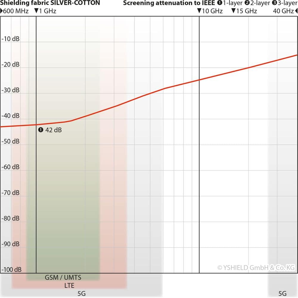 Manche Firmen bieten „spezielle“ 5G-Abschirmprodukte an. Dieses Produkt schirmt auch ohne extra Werbung dafür 5G-Frequenzen ab! In allen Schirmdiagrammen finden Sie zwei graue Balken mit den 5G-Frequenzspektren FR1 (600 MHz – 6 GHz) und FR2 (24 GHz – 40 GHz).