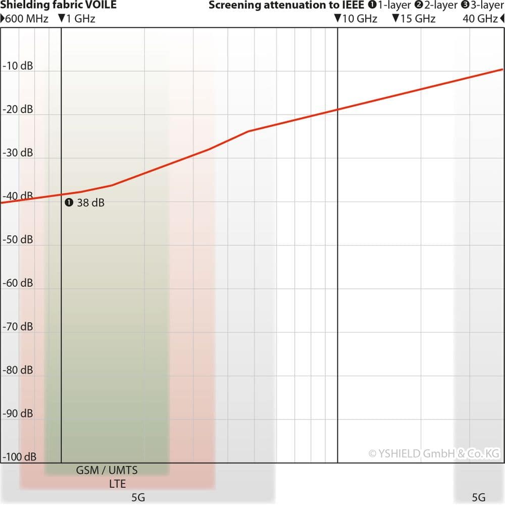 Dieses Produkt schirmt hochfrequente elektromagnetische Felder (HF) ab. Wenn nicht anders angegeben, gelten die angegebenen dB-Werte bei 1 GHz. Messungen von 600 MHz bis 40 GHz nach Standards ASTM D4935-10 oder IEEE Std 299-2006.