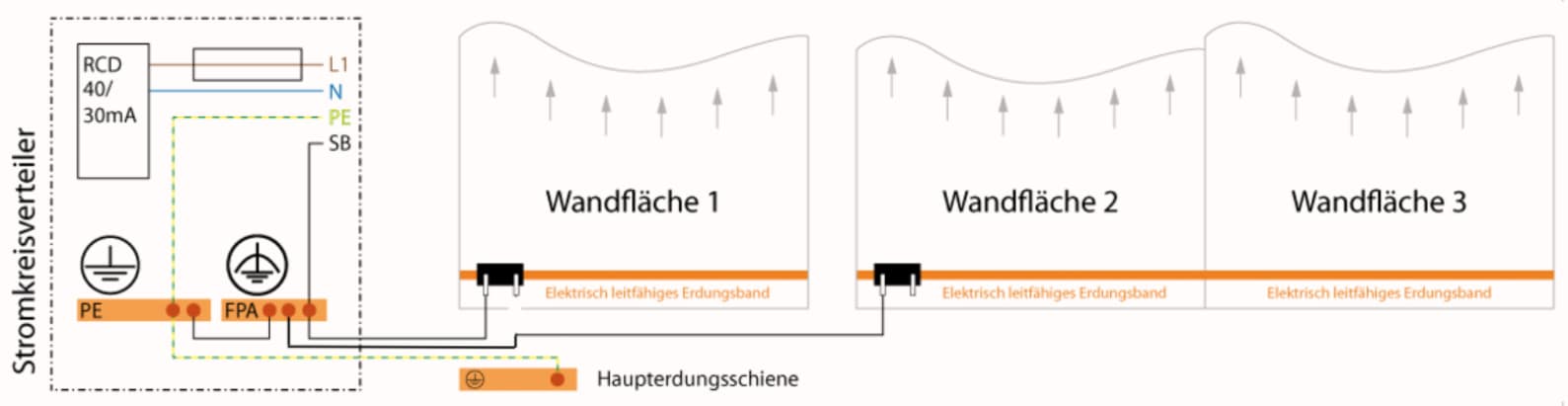 - Der Funktionspotentialausgleich (FPA) dient bei grossflächigen Abschirmungen der Minimierung niederfrequenter elektrischer Wechselfelder. Dabei werden die Abschirmflächen nach Bild 5, 6, 7 und 8 mit dem Funktionspotentialausgleich (FPA) verbunden. Der hierfür verwendete Leiter sollte einen Querschnitt von ≥ 4 mm2 haben und aus CU-Litze bestehen. Der effektive Querschnitt des Leiters muss am Objekt anhand der Fläche bestimmt werden. Um Verwechslungen mit dem Schutzleiter (PE) zu vermeiden, darf der FPA nicht die Farben grün-gelb haben.
