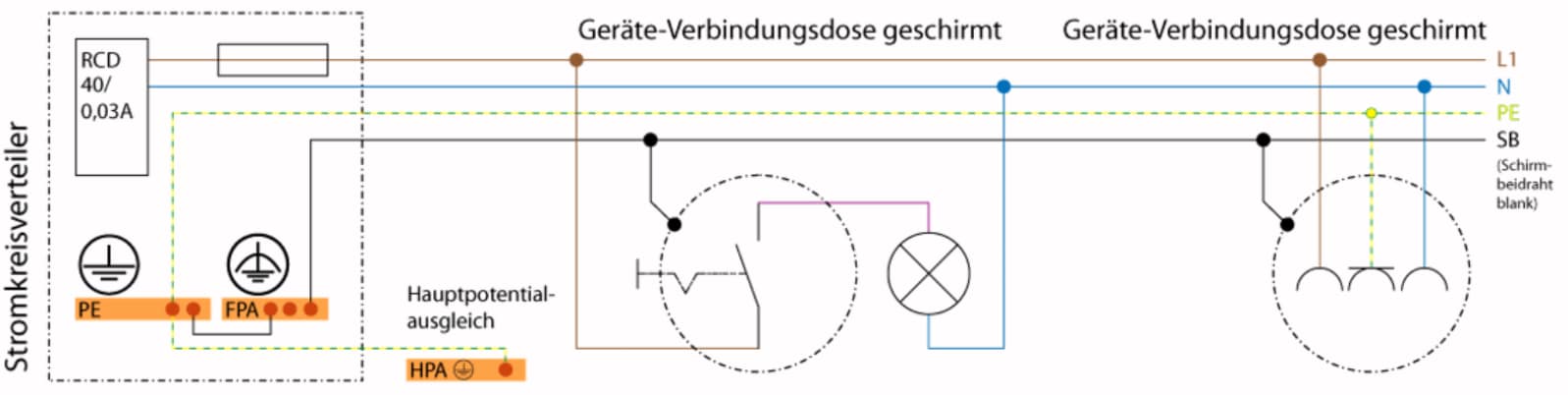 - Der Funktionspotentialausgleich (FPA) dient bei geschirmten Installationen der Minimierung niederfrequenter elektrischer Wechselfelder. Dabei werden die Anschlussdrähte der beschichteten Gerätedosen (Bild 3) mit den Schirmbeidrähten (SB) der geschirmten Installationsleitungen (Bild 2) zur Schiene des FPA geführt (Bild 1, keine weitere Verbindung mit einem Schutzleiter). PE und FPA werden mit der Haupterdungsschiene verbunden. Um Verwechslungen mit dem Schutzleiter (PE) zu vermeiden, ist der Schirmbeidraht (SB) transparent zu isolieren und anschliessend mit transparenten Dosenklemmen zu verbinden (Bild 4).