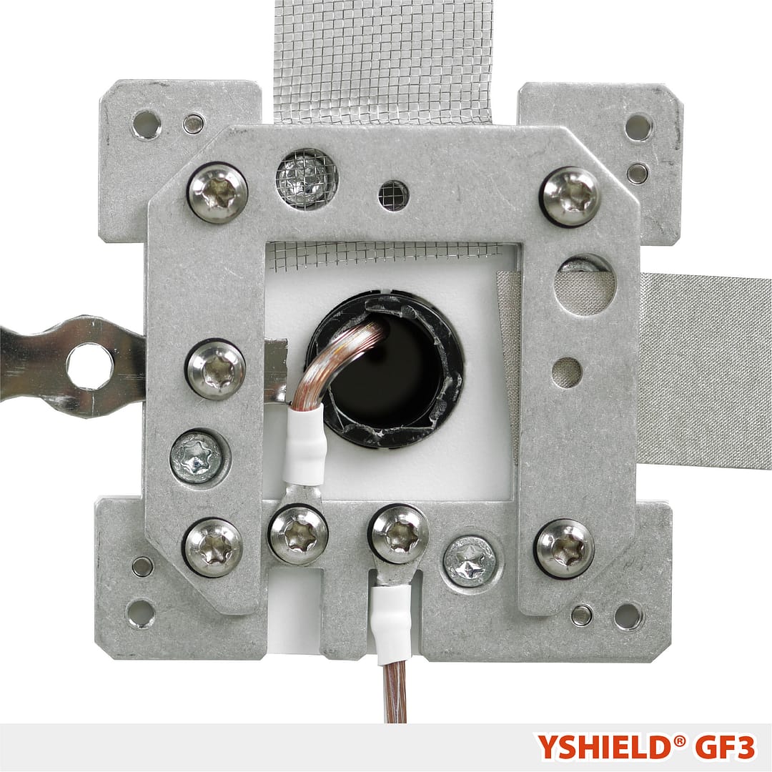 Mittleres Auf- und Unterputzgehäuse 80×80 mm zur Montage direkt auf Abschirmprodukten oder zum Einklemmen von Erdungsbändern. Mit drei Klemmpunkten für Erdungsbänder für alle Flächen mit Abschirmfarbe, Abschirmgewebe, Abschirmputz, Armierungsgewebe. Verwendung im Innen- und Außenbereich (zusätzliche Abdichtung erforderlich). Pro zusammenhängender Fläche wird ein Stück benötigt. Unterputz mit 11 mm Höhe dünner als eine Trockenbauplatte.