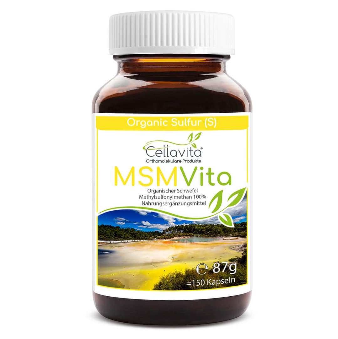 MSM (Methylsulfonylmethan) = Organischer Schwefel, bekannt als Methylsulfonylmethan (MSM), macht neben Wasser und Natrium den größten Teil unseres Körpers aus. Gleichwohl gehört er zu den vergleichsweise wenig erforschten Naturstoffen. MSM ist ein wichtiger Metabolit von Dimethylsulfoxid (DMSO), ein Zwischenprodukt des Zellstoffwechsels des DMSO, dessen biochemische Eigenschaften und biologische Anwendungsbereiche in vielen Studien bereits untersucht wurden.